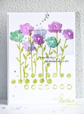 What an inspiring, artistic card, I'm sure you'll all agree! You have so many possibilities here for CASEing staring from the flower theme, the colors, her layout and techniques. See Marjan's blog for all the details! Don't worry too much about the "Own Twist" -it can be anything from changing up the colors a bit to adding some own personal touches. The most important thing is to have fun!